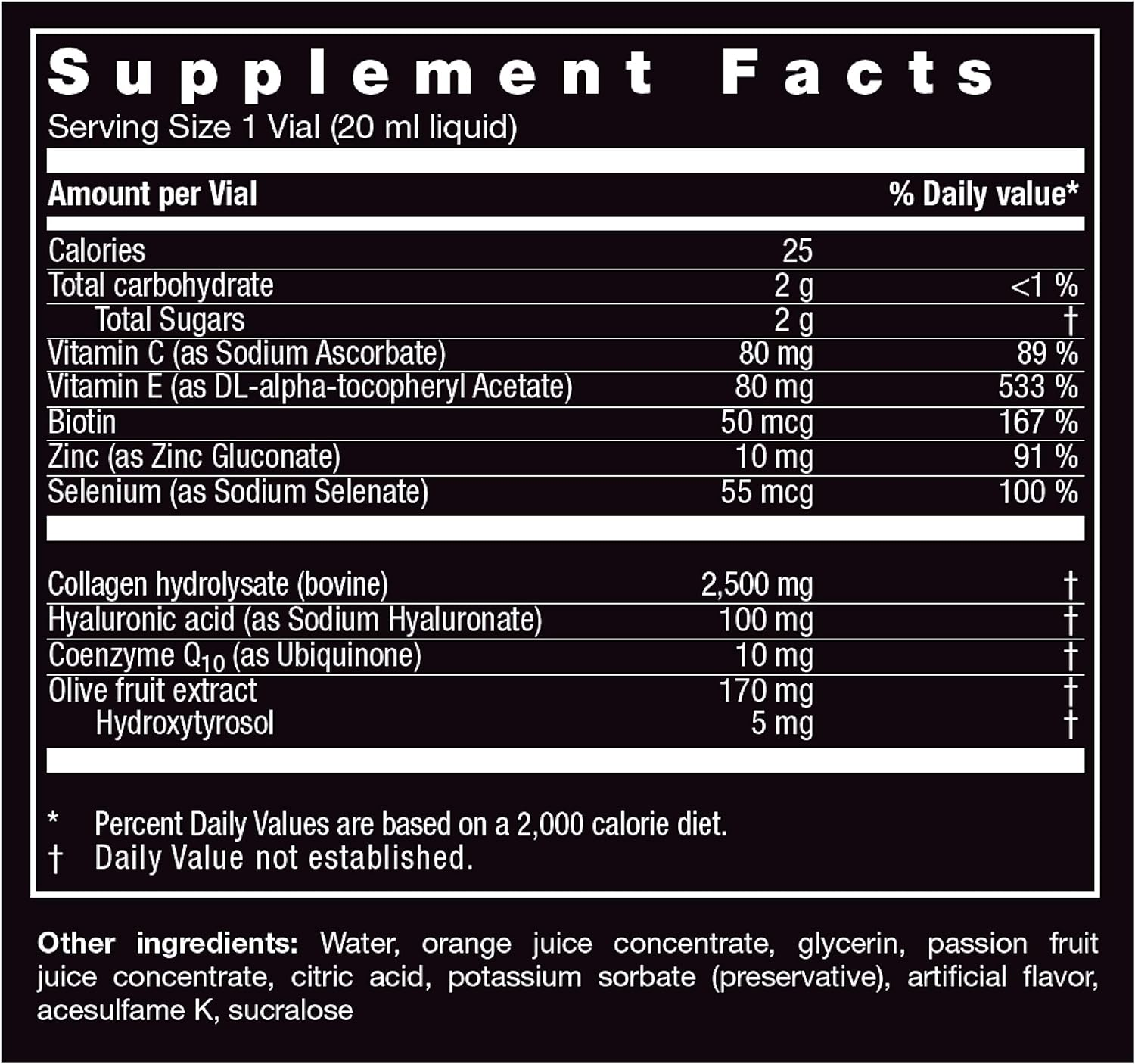 List of ingredients: 2500 mg of Collagen Hydrolysate, 100 mg of Hyaluronic Acid, 10 mg of Coenzyme Q10, 170 mg of Olive fruit extract, 5 mg of Hydroxtyrosol, 80 mg of Vitamin C, 80 mg of Vitamin E, 50 mcg of Biotin, 10 mg of Zinc, 55 mcg of Selenium