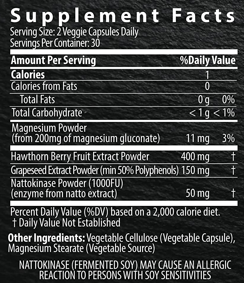 This supplement contains healthy natural ingredients such as Hawthorn, Magnesium, Nattokinase and Grape Seed Extract all of which are thought to have amazing benefits for the cardiovascular system.†