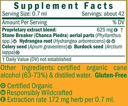 Stone Breaker features Chanca Piedra (known as ‘Stone Breaker’), extracted from the whole herb of Phyllanthus spp. plants which are responsibly wildcrafted in their native Peruvian habitat. It also features Hydrangea extract, prepared from the root of responsibly wildcrafted Hydrangea arborescens plants.