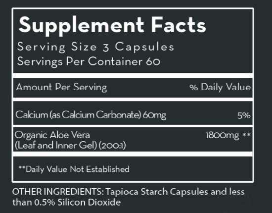 INGREDIENTS: Each serving (3 capsules) contains 1800 mg of Organic Aloe Vera (Leaf and Inner Gel), 60 mg of calcium carbonate (to raise the pH of the aloe), and trace amounts of silicon dioxide (a naturally occurring earth mineral) as a drying agent.