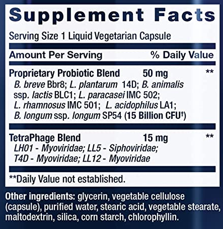 FLORASSIST® GI now delivers SEVEN probiotic strains: B. breve Bbr8; L. plantarum 14D; B. animalis ssp. lactis BLC1; L. paracasei IMC 502; L. rhamnosus IMC 501; L. acidophilus LA1; B. longum ssp. longum SP54. Together, there are 15 billion colony forming units (or CFUs) per capsule of these probiotic strains. Plus, the FLORASSIST® probiotic blend is formulated to work in synergy with the TetraPhage blend.7