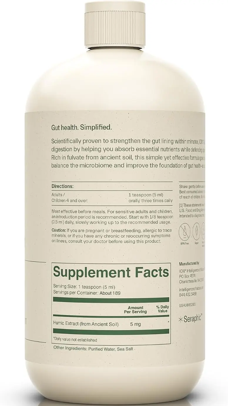 ION* Gut Support contains two optimally balanced, simple ingredients: humic extract and purified water. Our humic extract is derived from ancient soil rich in beneficial metabolites. These metabolites combined with trace minerals create fulvate, a unique family of molecules that is at the heart of our science.