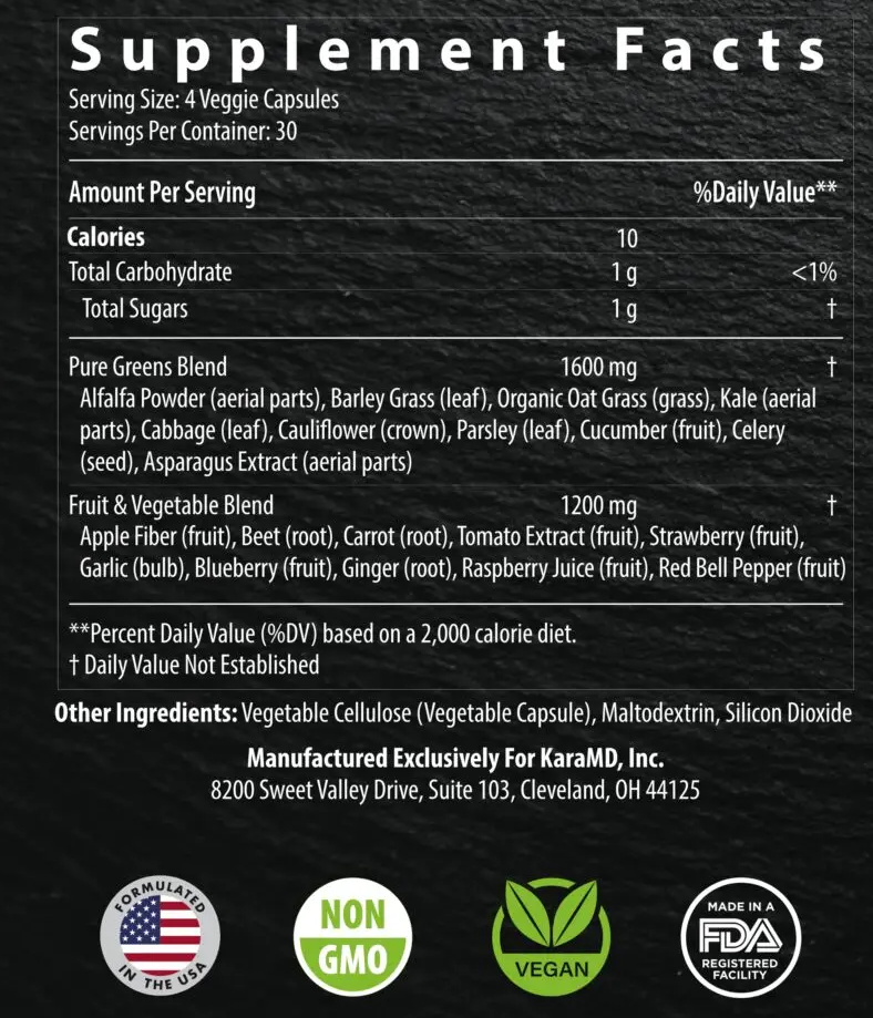 KaraMD Pure Nature uses a proprietary whole-food formula packed with powerful essential nutrients, antioxidants, and fiber to help provide your body with energy and digestion support.