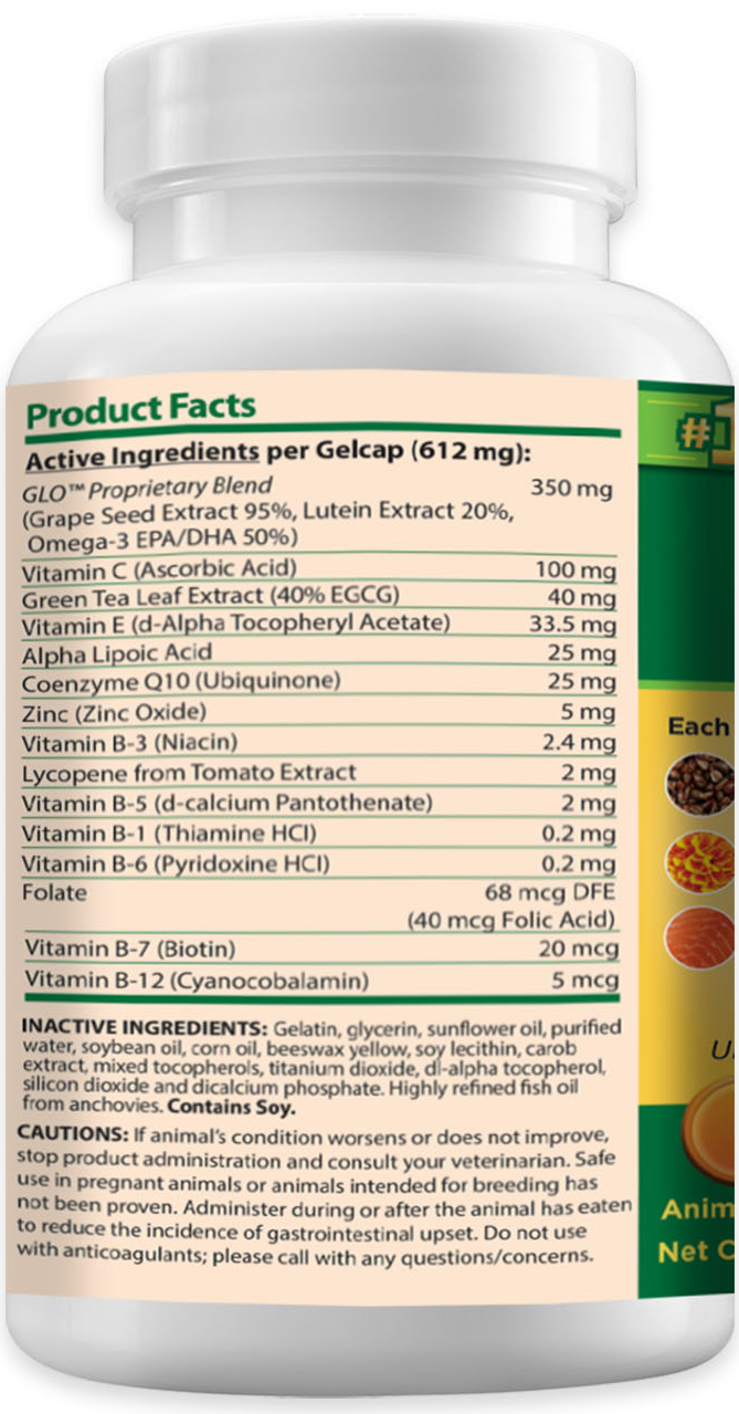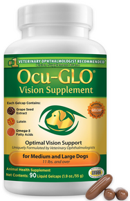 OcuGLO® Canine Vision Supplement Gelcaps for Dogs is a blend of different antioxidants that complement traditional therapy. This supplement is formulated to protect vital cells in the eye against free radical damage in order to support cellular health and normal eye cell function.