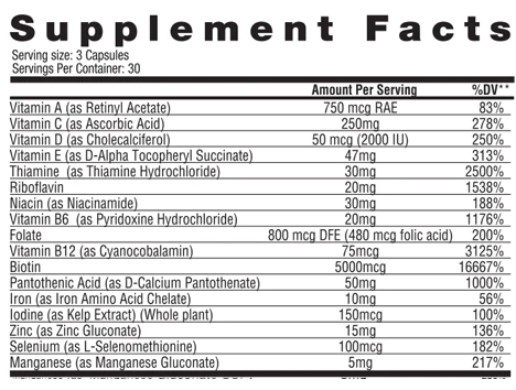 Vitamin A 2500ius, Vitamin C 250mg, Vitamin D3 2000iu, Vitamin E 70 ius, Thiamine 30mgs, Riboflavin 20mgs, Niacin 30mg, Vitamin B6 20mgs, Folate 800mcg, Vitamin B12 75mcg, Biotin 5000mcg, Pantothenic Acid 50mgs, Iron 10mg, Iodine 150mcg, Selenium 100mcg, Manganese 5mg