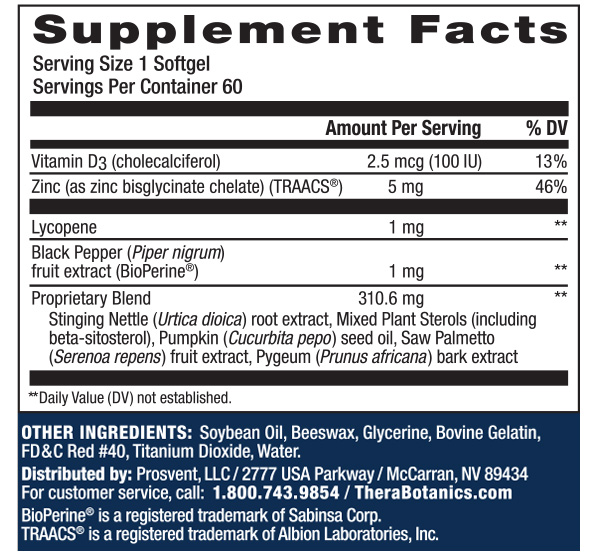 Prosvent is a comprehensive, proprietary, safe and natural formula that has been shown to improve prostate health and support urinary function. It contains 4 herbs – including Beta Sitosterol, which in clinical studies shows to help support the health of an aging prostate. And best of all, everything is combined in an easy-to-swallow soft gel capsule with Bioperine® to increase absorption!