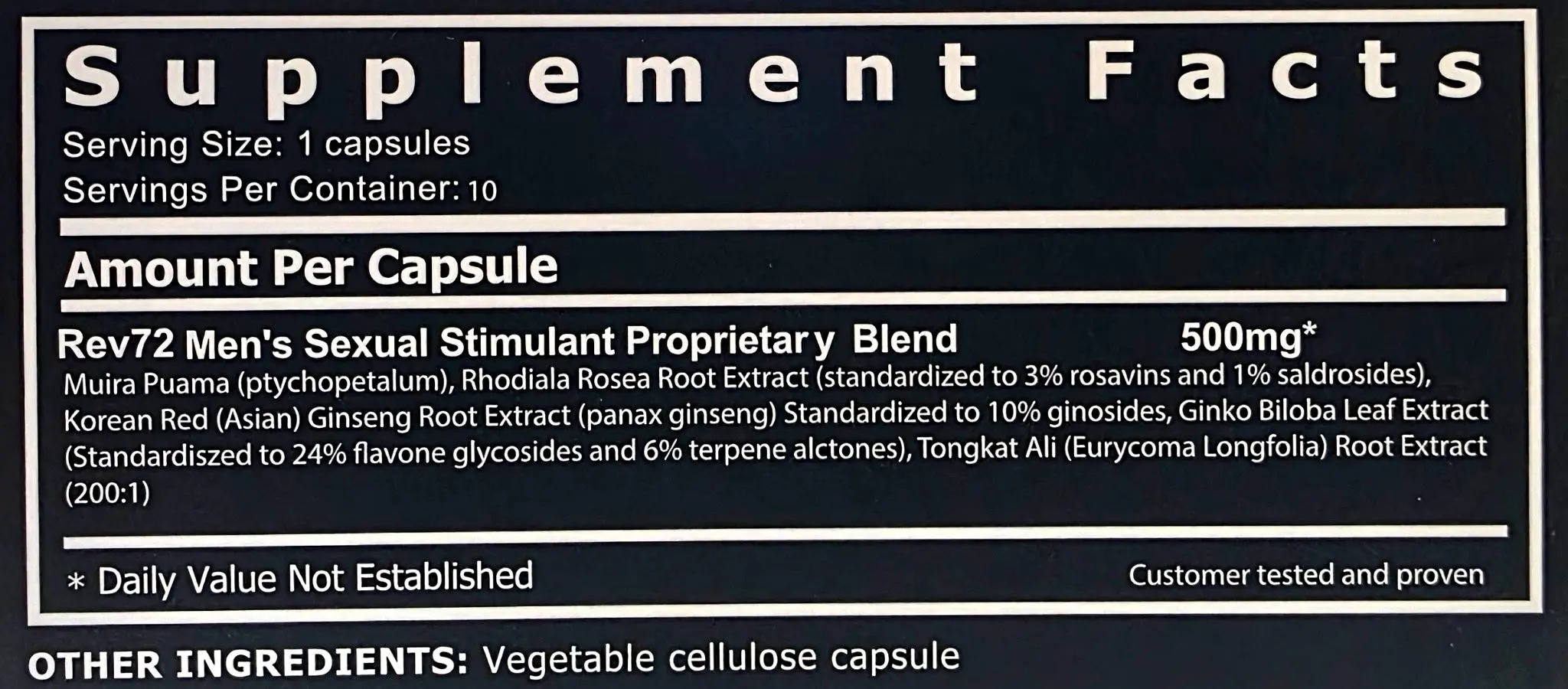 Rev 72 works as a stimulant it really get you going when the mood is set. One usually last me about 2 to 3 days. No headache or any side effects. It does work better on a empty stomach… so if you are looking for a little help this is it.