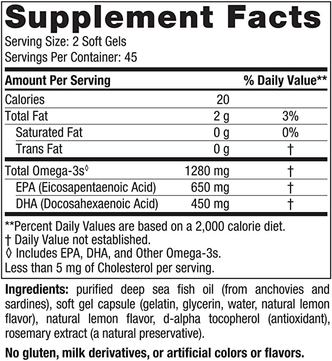 • 1280 mg total omega-3s (soft gels); 2840 mg total omega-3s (liquid)