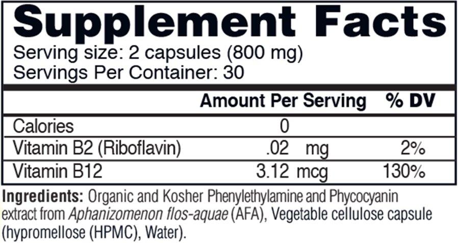This formula contains the ingredient in wild-harvested AFA that may help promote mood balance and enhanced focus*. PEA is a naturally occurring extract from AFA and research suggests that PEA may support a positive mood balance and give you the ability to manage everyday stress by modulating the release of neurotransmitters (norepinephrine and dopamine).* PEA (also found in chocolate) is a naturally occurring extract that may promote clear thinking and focus to give you optimal cognitive function.*