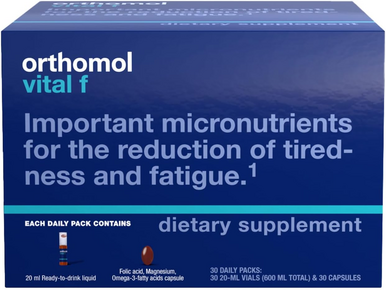 Orthomol Vital F is a food supplement. It contains important micronutrients such as B vitamins and magnesium that contribute to normal energy-yielding metabolism and normal functioning of the nervous system. With omega-3 fatty acids.*