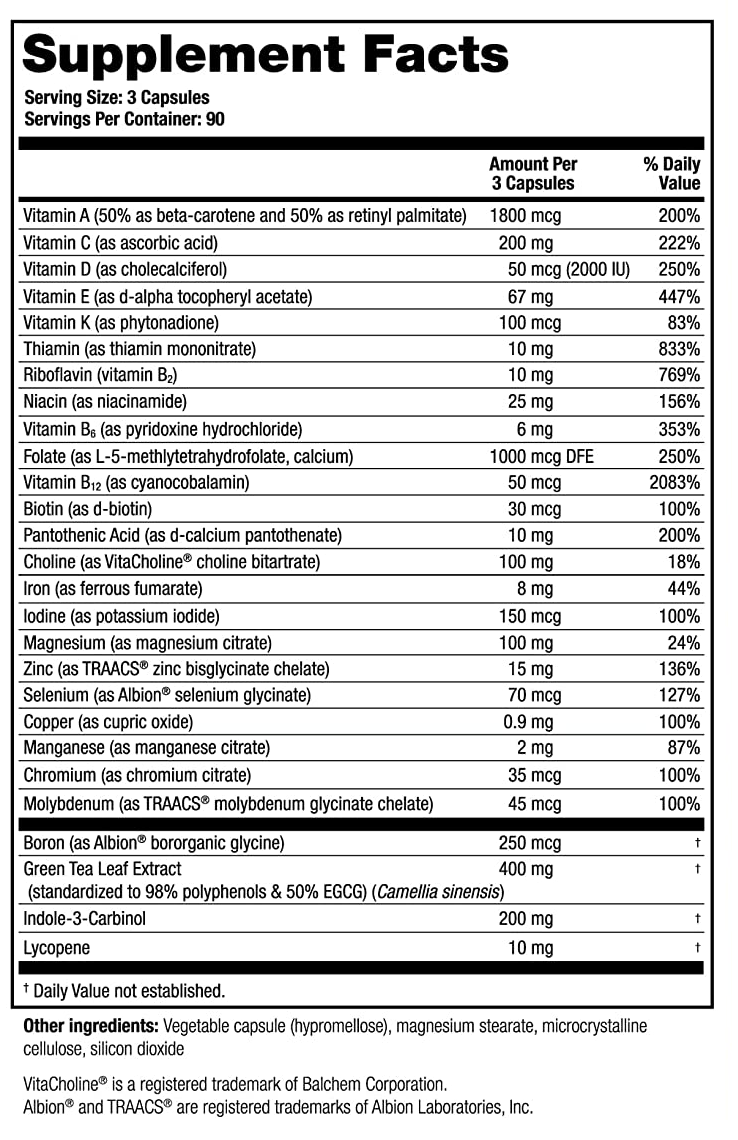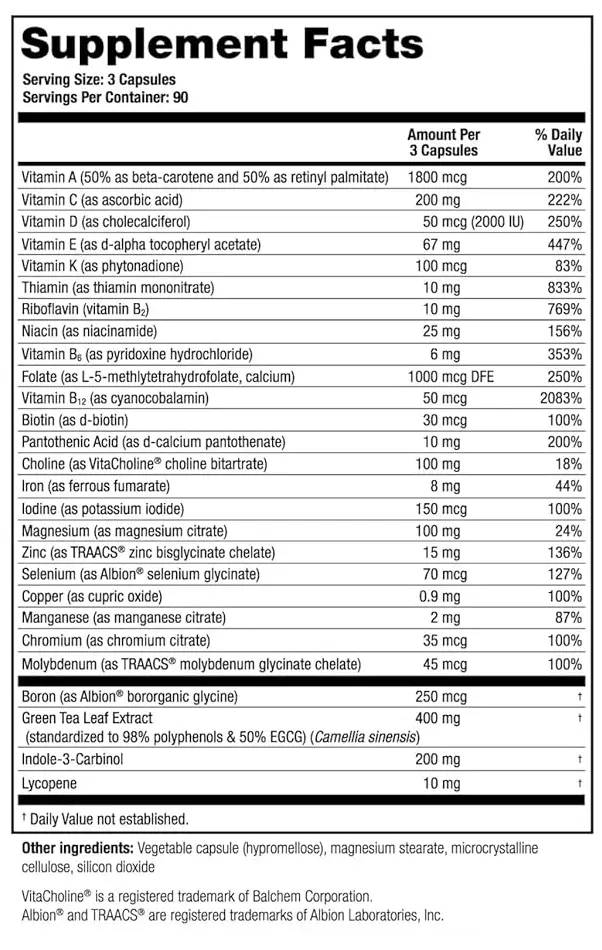Contains higher doses of B vitamins, antioxidants, vitamin D, green tea extract, and I3C, plus other important vitamins and minerals.