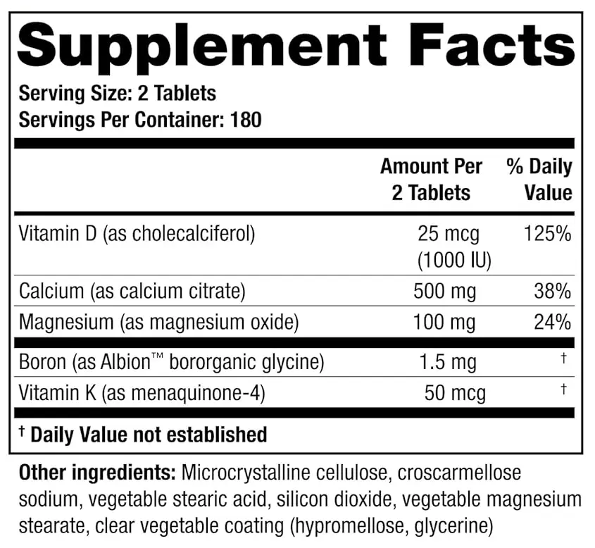 STRONG, HEALTHY BONES: This formula contains 1000 mg of calcium (per 4 tablets), vitamin D3, vitamin K2 and other nutrients essential for promoting bone strength and overall bone health.*