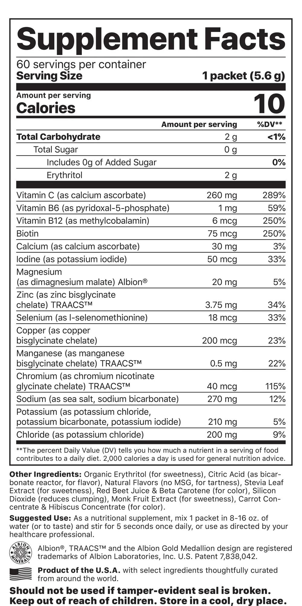 Active Ingredients: Vitamin C (as calcium ascorbate), Vitamin B6 (as pyridoxal-5-phosphate), Vitamin B12 (as methylcobalamin), Biotin, Calcium (as calcium ascorbate), Iodine (as potassium iodide), Magnesium (as dimagnesium malate), Zinc (as zinc bisglycinate chelate), Selenium (as l-selenomethionine), Copper (as copper bisglycinate chelate), Manganese (as manganese bisglycinate chelate), Chromium (as chromium nicotinate glycinate chelate), Sodium (as sea salt, sodium bicarbonate), Potassium (as potassium chloride, potassium glycinate complex, potassium bicarbonate, potassium Iodide).