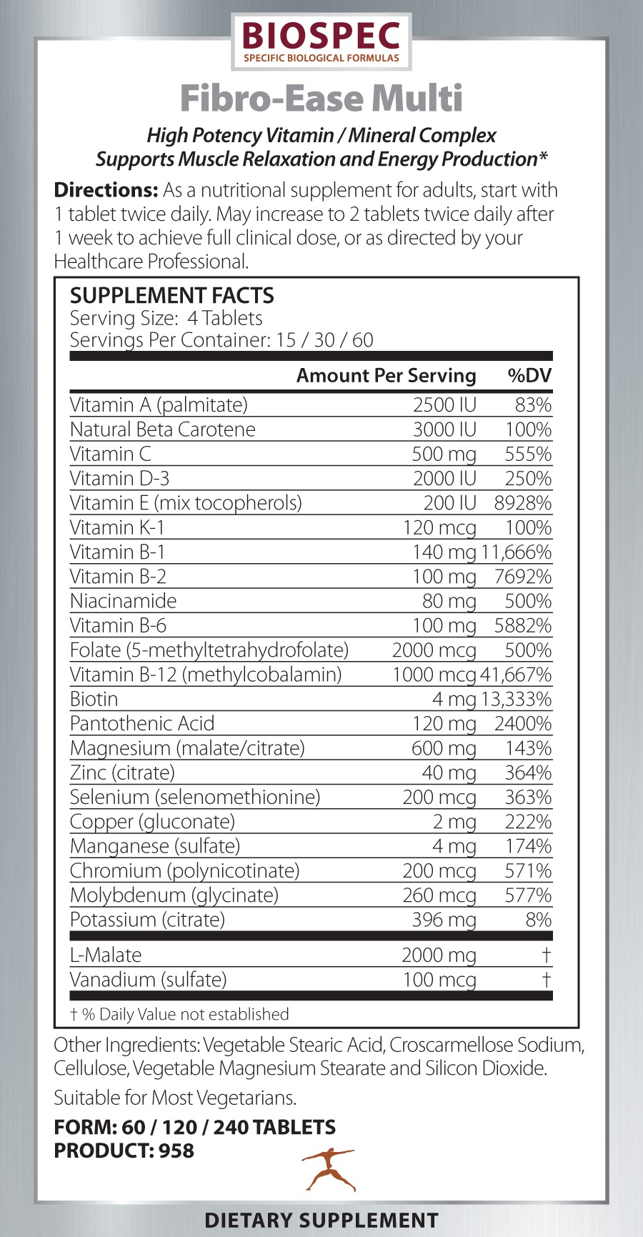 Fibro-Ease Multi is a complete, highly specialized multivitamin multimineral formula designed for patients who suffer with Muscle Pain, Muscle Tenderness, Fibromyalgia and Chronic Fatigue.*