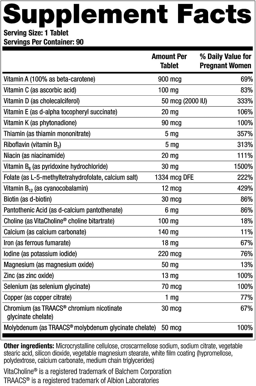 Contains methylated folate, 50 mcg (2,000 IU) of vitamin D3, choline, iodine, and other essential nutrients to prepare your body for pregnancy.